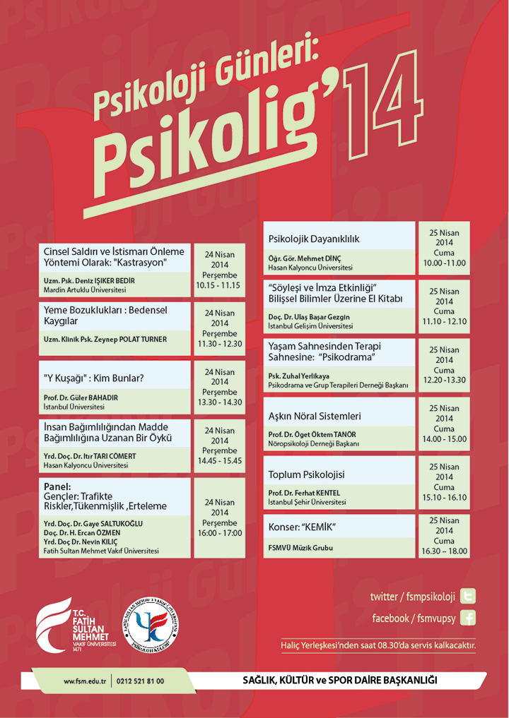 Üniversitemiz, Psikoloji Kulübü tarafından düzenlenecek olan “Psikoloji Günleri: Psikolig’14 Etkinliği” 24-25 Nisan tarihlerinde saat 10:00’ da Kandilli Yerleşkesi Konferans salonunda gerçekleştirilecektir. Etkinlikle ilgili detaylar ektedir.