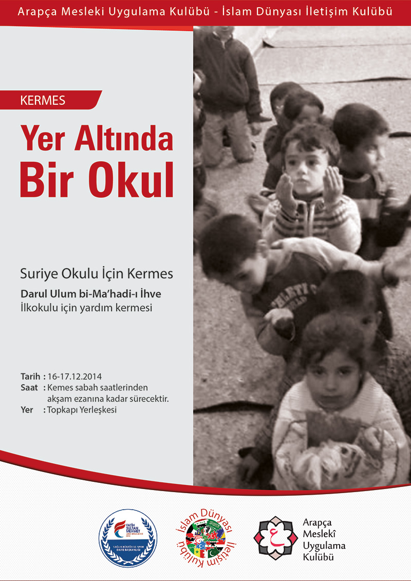 Üniversitemiz Arapça Mesleki Uygulama Kulübü ve İslam Dünyası İletişim Kulübü tarafından düzenlenecek olan Yer Altında Bir Okul konulu 16-17 Aralık 2014 tarihlerinde Topkapı Yerleşkesinde kermes gerçekleştirilecektir. Kermese,