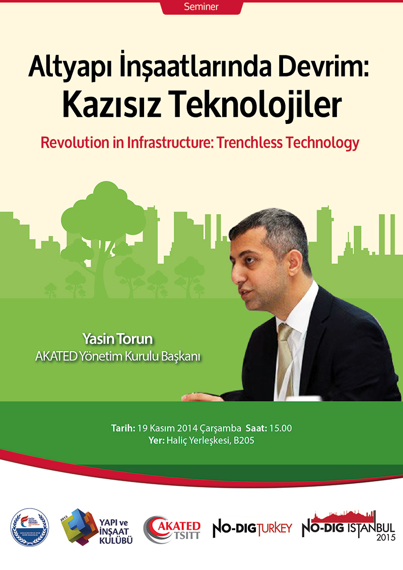 Üniversitemiz Yapı ve İnşaat Kulübü tarafından düzenlenecek olan “Altyapı İnşaatlarında Devrim: Kazısız Teknolojiler Semineri” 19 Kasım 2014 (Çarşamba) saat 15:00’de Haliç Yerleşkesi B205 nolu salonda, AKATED Yönetim Kurulu Başkanı Yasin Torun tarafından verilecektir. Seminere, tüm akademik ve idari personel ile öğrencilerimiz davetlidir.