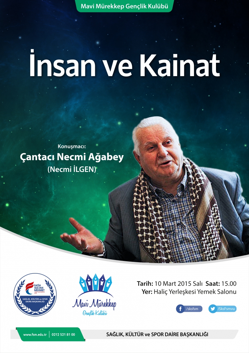 Üniversitemiz Mavi Mürekkep Gençlik Kulübü, tarafından düzenlenecek olan ” İnsan ve Kainat Semineri” 10 Mart 2015 Salı günü saat 15:00’de Haliç Yerleşkesi konferans (yemekhane) salonunda , Necmi İLGEN tarafından verilecektir. Seminere, tüm akademik ve idari personelimiz ile öğrencilerimiz davetlidir.