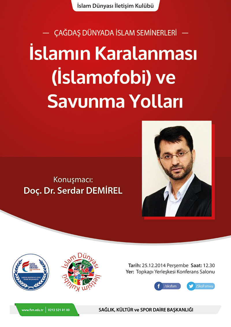 Üniversitemiz Sağlık Kültür ve Spor Daire Başkanlığı ,İslam Dünyası İletişim Kulübü tarafından düzenlenecek olan “İslamın Karalanması(İslamofobi) ve Savunma Yolları Semineri” 25 Aralık 2014 saat 12:30'da Topkapı Yerleşkesi Konferans Salonunda , İslami İlimler Fakültesi Öğretim Üyemiz Doç.Dr. Serdar DEMİREL’in sunumuyla gerçekleştirilecektir. Seminere , tüm akademik ve idari personelimiz ile öğrencilerimiz davetlidir.