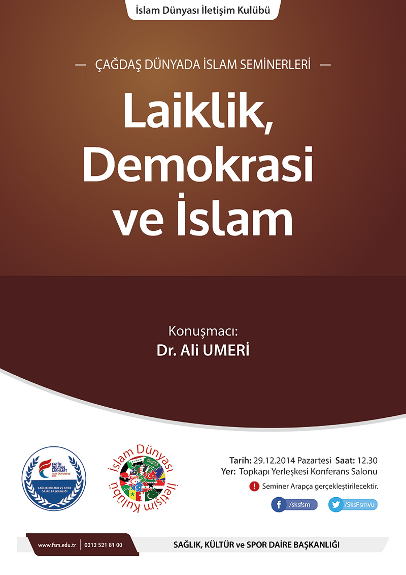 Üniversitemiz Sağlık Kültür ve Spor Daire Başkanlığı, İslam Dünyası İletişim Kulübü tarafından Çağdaş Dünyada İslam Seminerleri kapsamında dördüncüsü düzenlenecek olan “Laiklik, Demokrasi ve İslam Semineri” 29 Aralık 2014 saat 12:30'da Topkapı Yerleşkesi konferans salonunda İslami İlimler Fakültesi Öğretim Görevlisi Dr. Ali UMERİ’ nin sunumuyla gerçekleştirilecektir. Seminere, tüm akademik ve idari personelimiz ile öğrencilerimiz davetlidir.