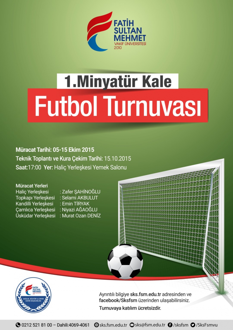 - Minyatür Kale Futbol Turnuvasına Fatih Sultan Mehmet Vakıf üniversitesi öğrencileri ile idari ve akademik personel katılabilir. Üniversite dışından katılım kabul edilmeyecektir.