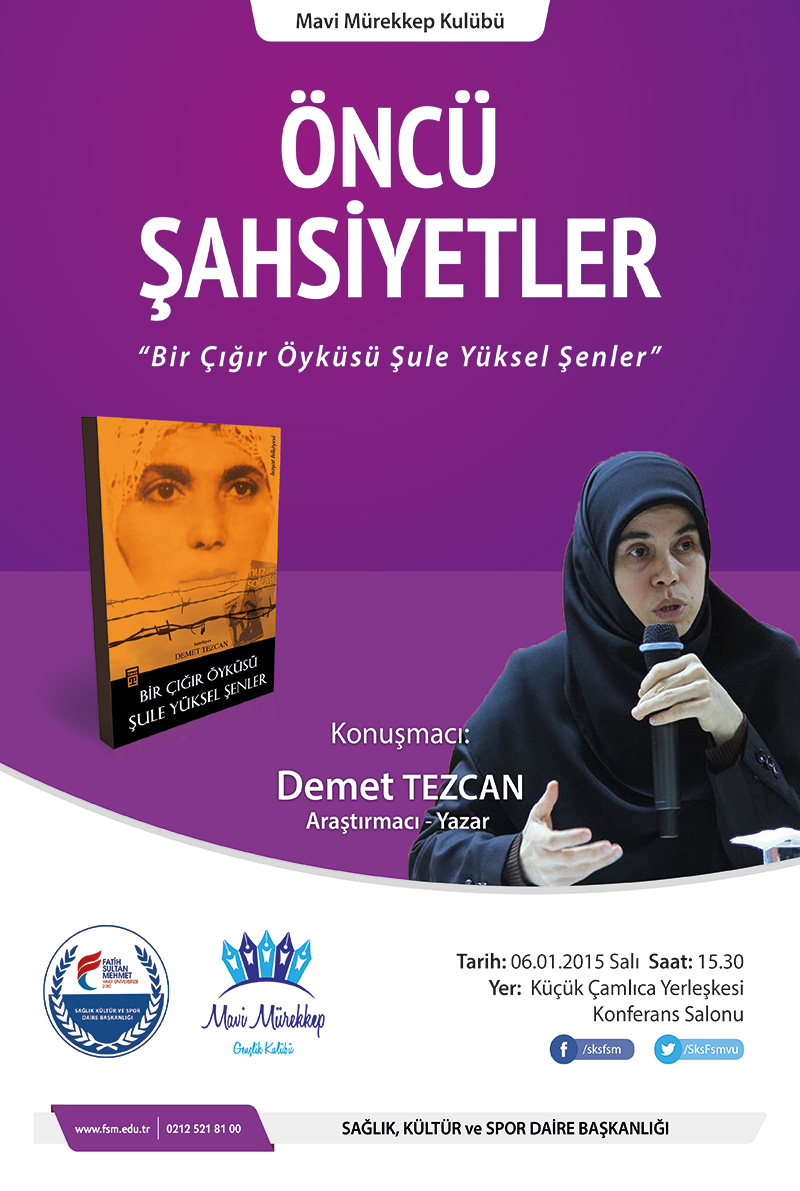 Üniversitemiz, Mavi Mürekkep Gençlik Kulübü tarafından düzenlenecek olan “Öncü Şahsiyetler; Bir Çığır Öyküsü Şule Yüksel Şenler” 6 Ocak 2015 saat 15:30'da Küçükçamlıca Yerleşkesi konferans salonunda, Araştırmacı-Yazar Demet TEZCAN’ın sunumuyla gerçekleştirilecektir. Konferansa, tüm akademik ve idari personelimiz ile öğrencilerimiz davetlidir.