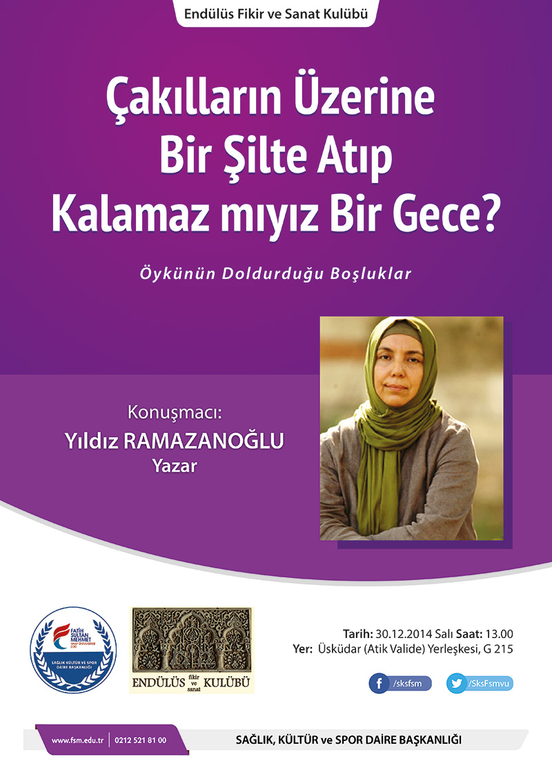 Üniversitemiz Sağlık Kültür ve Spor Daire Başkanlığı, Endülüs Fikir ve Sanat Kulübü tarafından düzenlenecek olan “Öykünün Doldurduğu Boşluklar Konferansı” 30 Aralık 2014 saat 13:00'da Üsküdar (Atik Valide) Yerleşkesi G205 nolu amfide, Yazar Yıldız RAMAZANOĞLU’nun sunumuyla gerçekleştirilecektir. Konferansa, tüm akademik ve idari personelimiz ile öğrencilerimiz davetlidir.