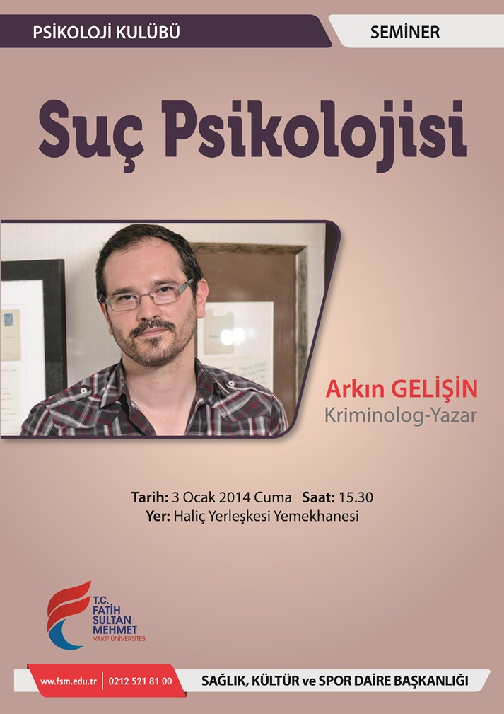 Üniversitemiz, Psikoloji Kulübü tarafından düzenlenecek olan "Suç Psikolojisi" konulu seminer 03.01.2014 tarihinde saat 15:30’da Haliç Yerleşkesi Konferans Salonunda (yemekhane) gerçekleştirilecektir. Seminer, Kriminolog-Yazar Arkın Gelişin tarafından verilecektir.