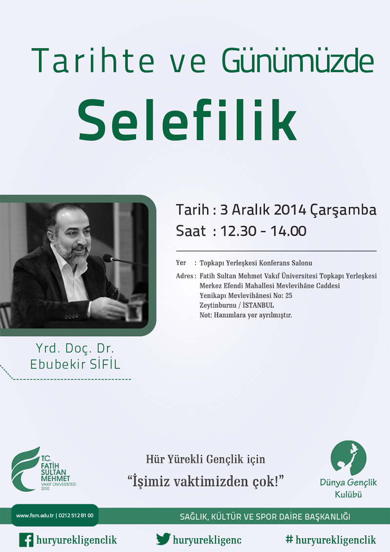 Üniversitemiz Dünya Gençlik Kulübü tarafından düzenlenecek olan "Tarihte ve Günümüzde Selefilik Konferansı" 03 Aralık 2014 saat 12:30'da Topkapı Yerleşkesi konferans salonunda, Yrd. Doç. Dr. Ebubekir Sifil'in sunumuyla gerçekleştirilecektir.Konferansa, tüm akademik ve idari personel ile öğrencilerimiz davetlidir.