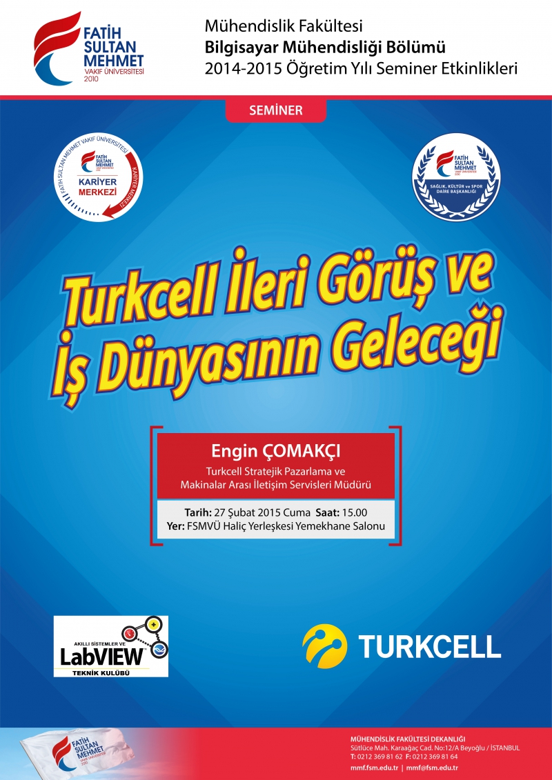 Üniversitemiz, Akıllı Sistemler ve LABVIEW Teknik Kulübü tarafından düzenlenecek olan “Turkcell İleri Görüş ve İş Dünyasının Geleceği Semineri” 27 Şubat 2015 saat 15:00'de Haliç Yerleşkesi konferans (yemekhane) salonunda,Turkcell Stratejik Pazarlama ve Makinalar Arası İletişim Servisleri Müdürü Engin ÇOMAKÇI tarafından verilecektir.