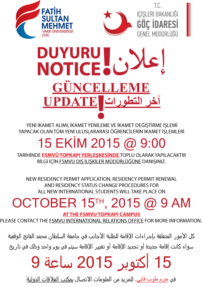 Göç İdaresi Genel Müdürlüğü 15 Ekim Perşembe günü sabah saat 09:00’da İstanbul Göç İdaresinde yapılacak olan ikamet işlemlerinin aynı saatte TOPKAPI YERLEŞKEMİZDE yapılacağını bildirilmiştir.