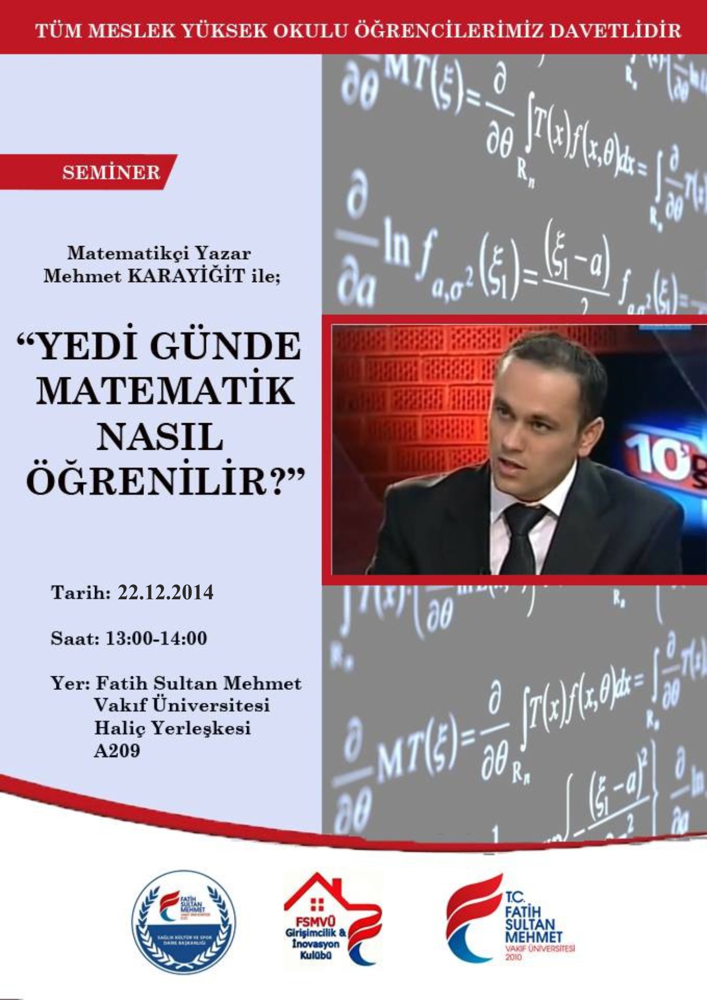 Üniversitemiz Girişimcilik ve İnovasyon Kulübü tarafından düzenlenecek olan “Yedi Günde Matematik Nasıl Öğrenilir? Semineri” 22 Aralık 2014 saat 13:00'de Haliç Yerleşkesi A 209 nolu amfide, Matematikçi-Yazar Mehmet Karayiğit'in sunumuyla gerçekleştirilecektir.Seminere, tüm akademik ve idari personelimiz ile öğrencilerimiz davetlidir.