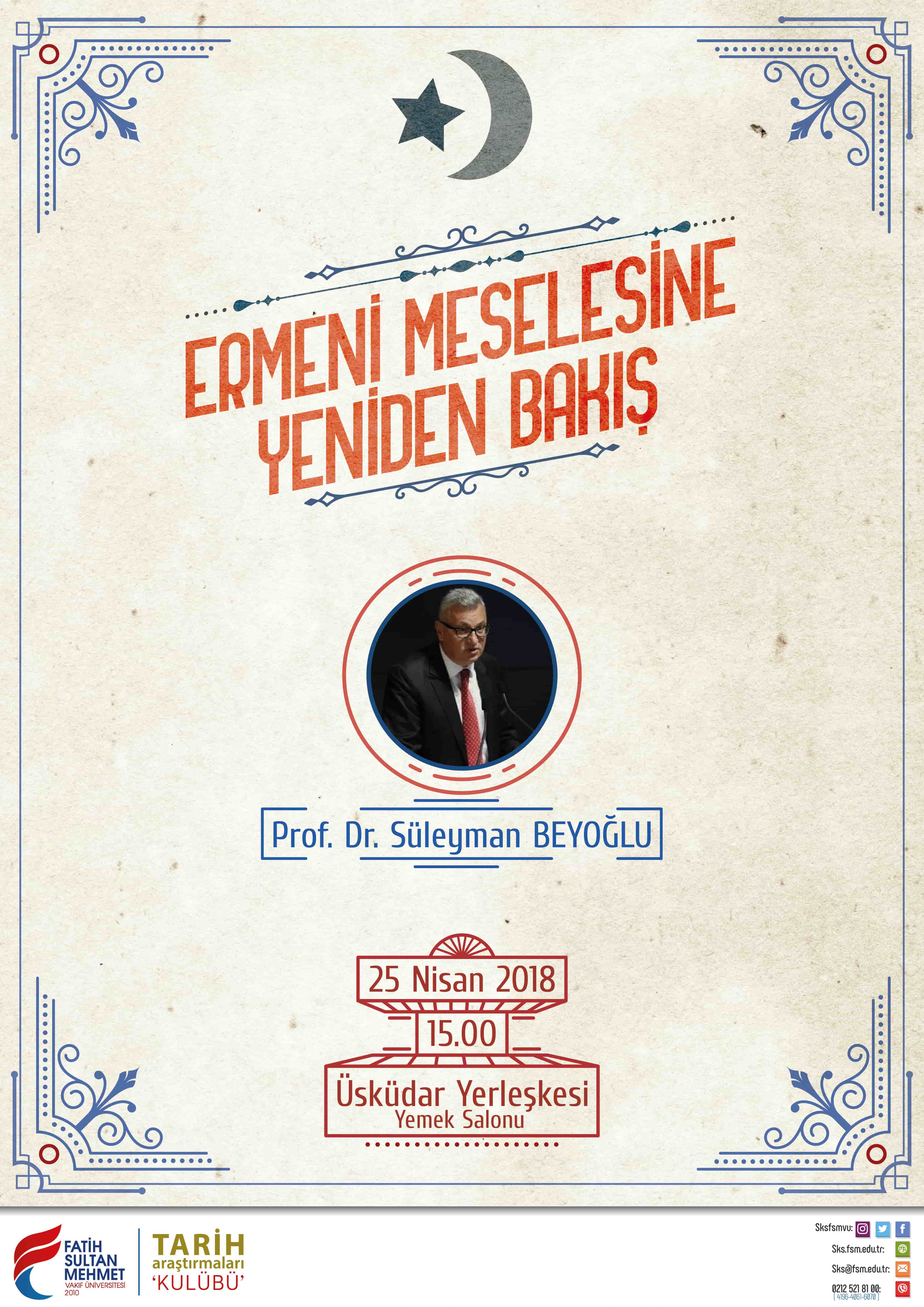 Üniversitemiz Tarih Araştırmaları Kulübü tarafından 25 Nisan 2018 tarihinde Prof. Dr. Süleyman Beyoğlu’nun konuşmacı olacağı “Ermeni Meselesine Yeniden Bakış” başlıklı konferans düzenlenecektir. Programa tüm öğrencilerimiz davetlidir.