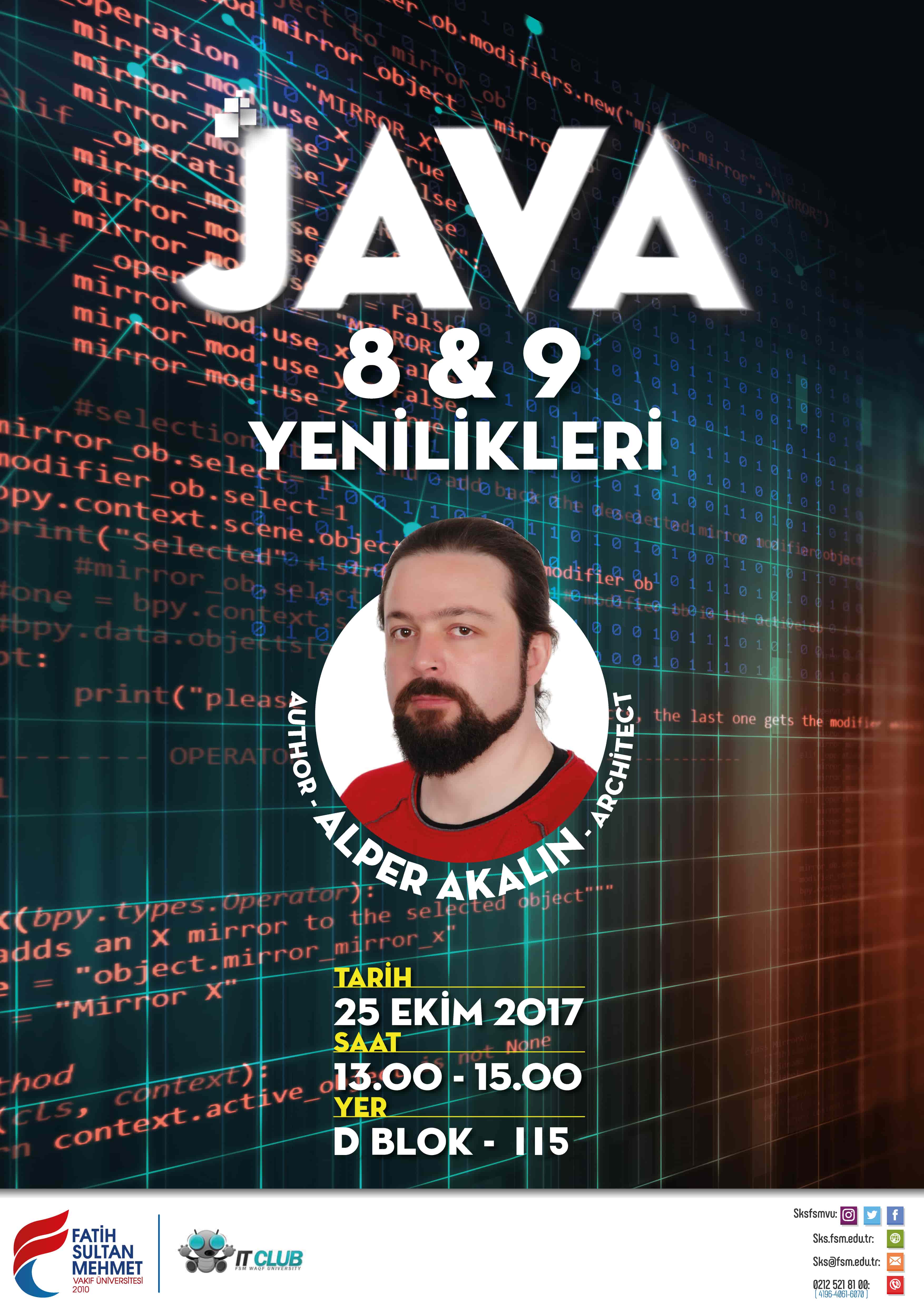Bilişim ve Teknoloji Kulübünün düzenleyeceği Java 8&9 Yenilikleri programı, 25 Ekim 2017, saat 13.00'te Alper Akalın'ın katılımıyla gerçekleştirilecektir.