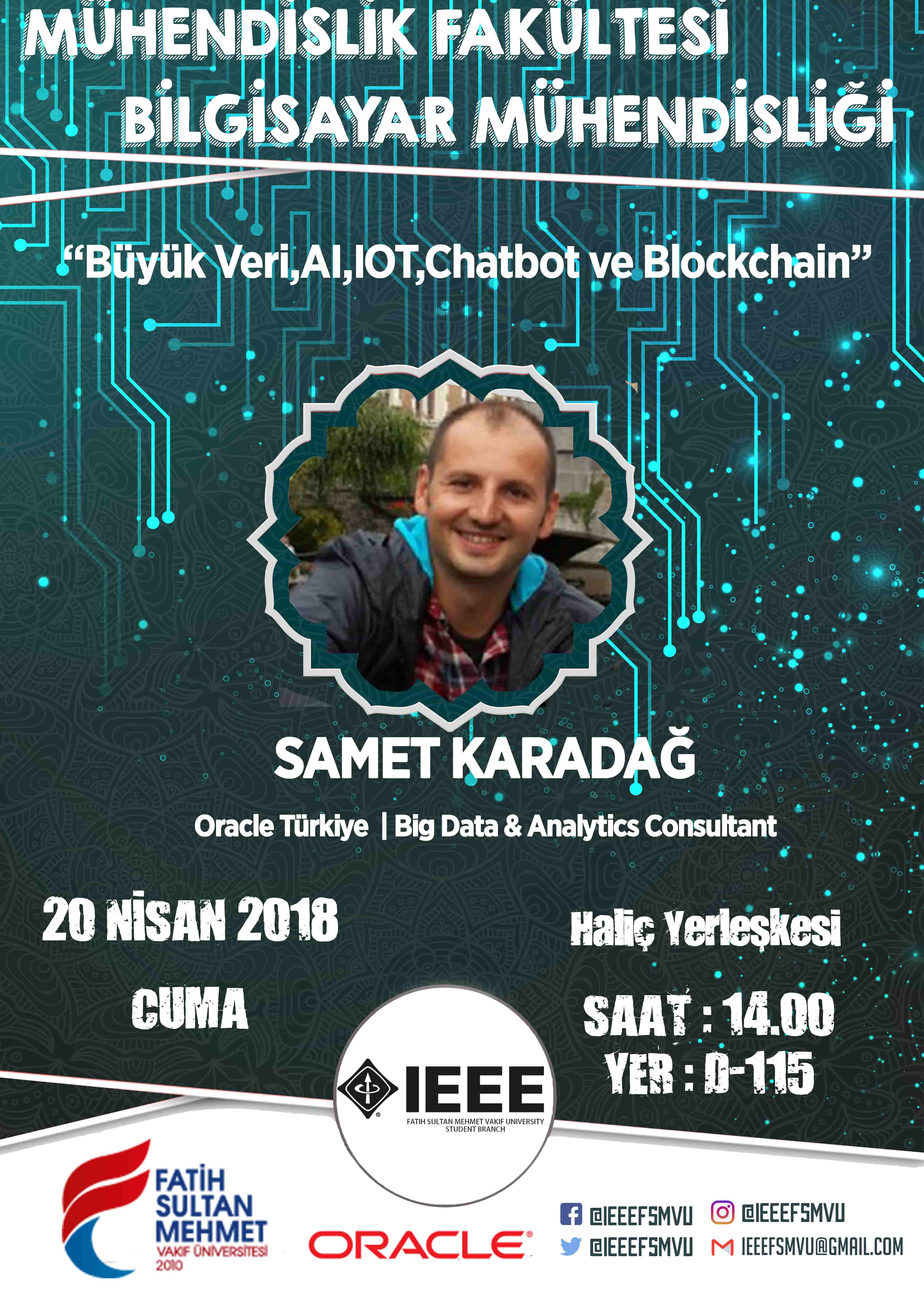 Üniversitemiz IEEEFSMVU Kulübü tarafından 20 Nisan 2018 tarihinde Samet Karadağ'ın konuşmacı olacağı “Büyük Veri, AI, IOT, Chatbot ve Blockchain” başlıklı konferans düzenlenecektir. Programa tüm öğrencilerimiz davetlidir.