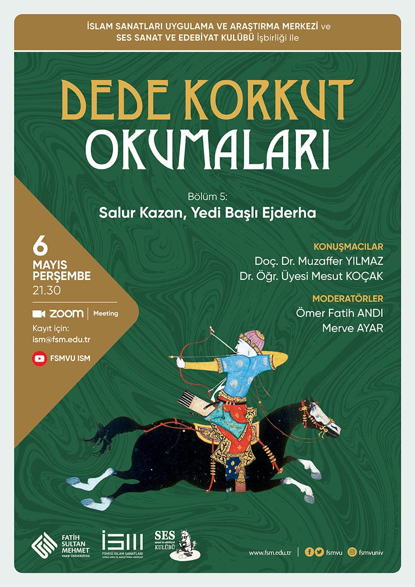 Ses Sanat ve Edebiyat Kulübümüz ile İslam Sanatları Uygulama ve Araştırma Merkezi işbirliğinde "Dede Korkut Okumaları" serisinin beşincisi 06 Mayıs 2021 tarihinde düzenlenecektir. Online düzenlenecek olan programa katılım için afiş üzerinde yer alan mail adreslerine ulaşabilirsiniz.