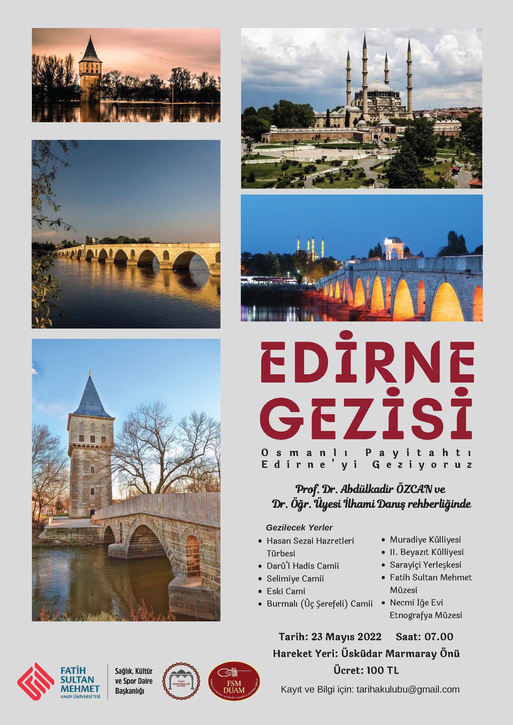 Tarih Araştırmaları Kulübü tarafından 23 Mayıs 2022 Pazartesi günü Osmanlı başkenti Edirne'ye gezi düzenlenecektir. Prof. Dr. Abdülkadir Özcan ve Dr. Öğr. Üyesi İlhami Danış'ın rehberliğindeki geziye tüm öğrencilerimiz davetlidir.