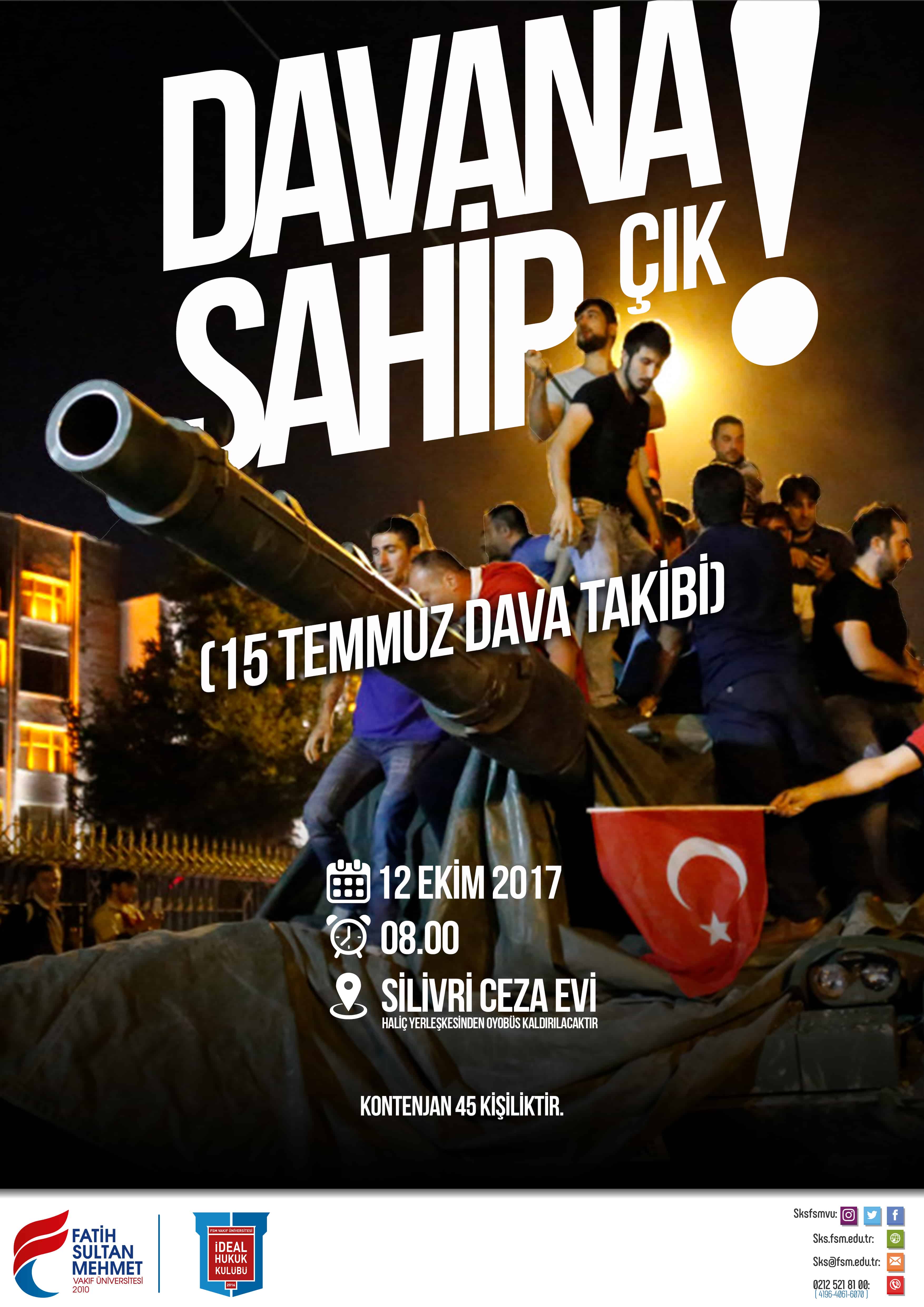 Üniversitemizin İdeal Hukuk Kulübü'nün düzenlediği "Davana Sahip Çık, 15 Temmuz Dava Takibi" programı 12 Ekim Perşembe günü gerçekleştirilecektir. 15 Temmuz davalarının görüldüğü Silivri'de izleyici olarak gidilecek program için kontenjan sınırlıdır.