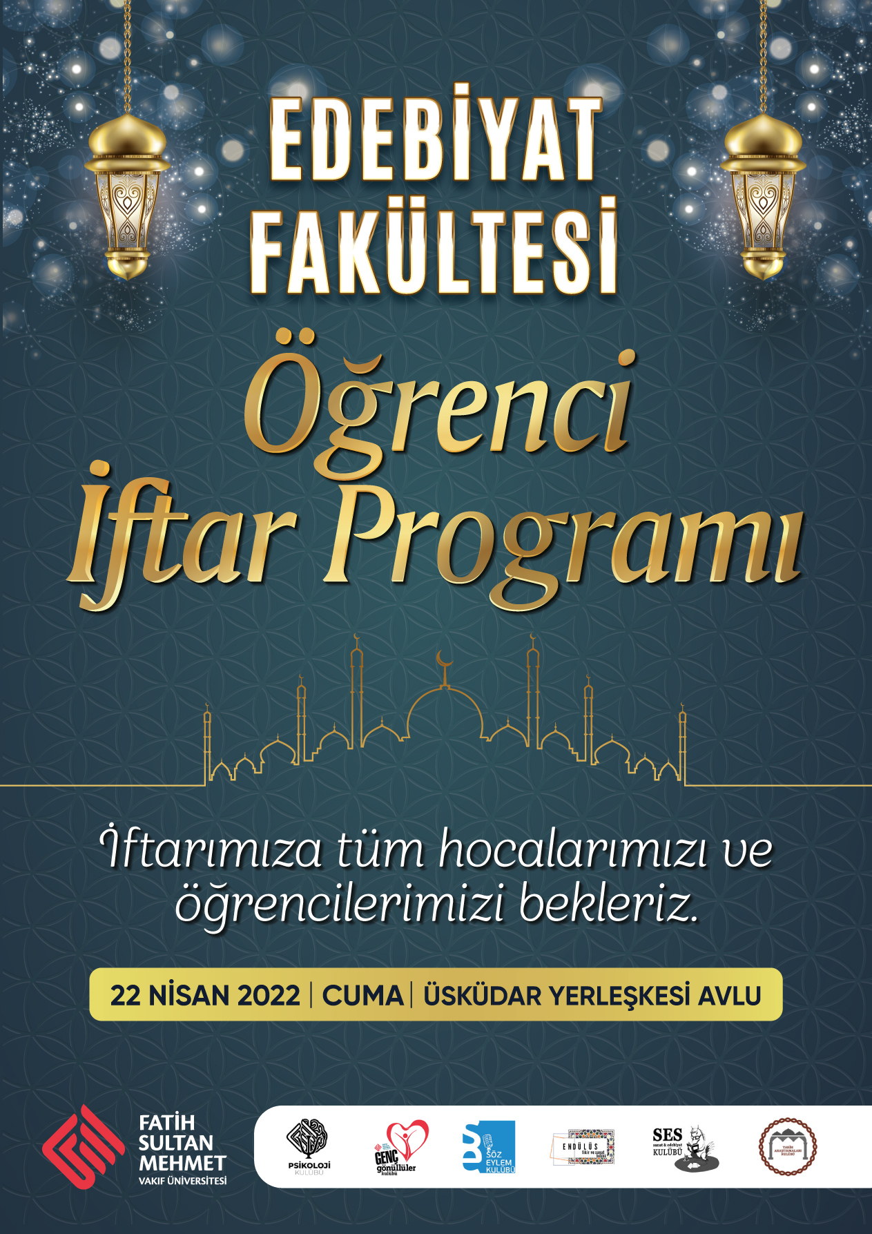 Her yıl düzenlenen ve heyecanla beklenen Atik Valide'de öğrenci iftarı 22 Nisan'da de düzenlenecektir. Edebiyat Fakültesi'nde yer alan öğrenci kulüplerimizin koordinasyonuyla planlanan iftara tüm akademik ve idari personelimizi ile öğrencilerimiz davetlidir.