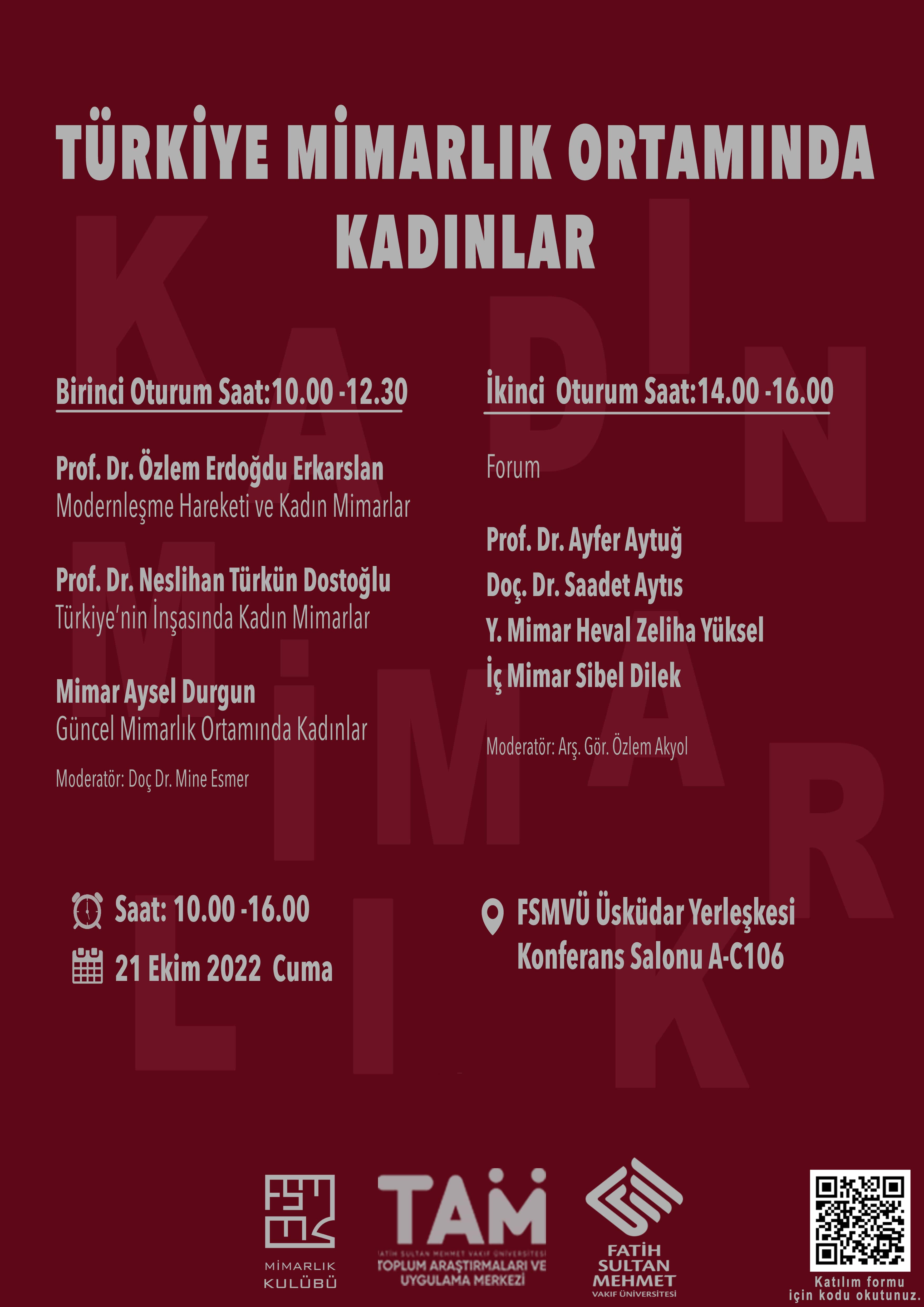 ''Türkiye Mimarlık Ortamında Kadınlar'' isimli panel 21.10.2022 Cuma günü Üsküdar Yerleşkesi Konferans Salonu A-C106' da düzenlenecektir. Tüm öğrencilerimiz davetlidir.
