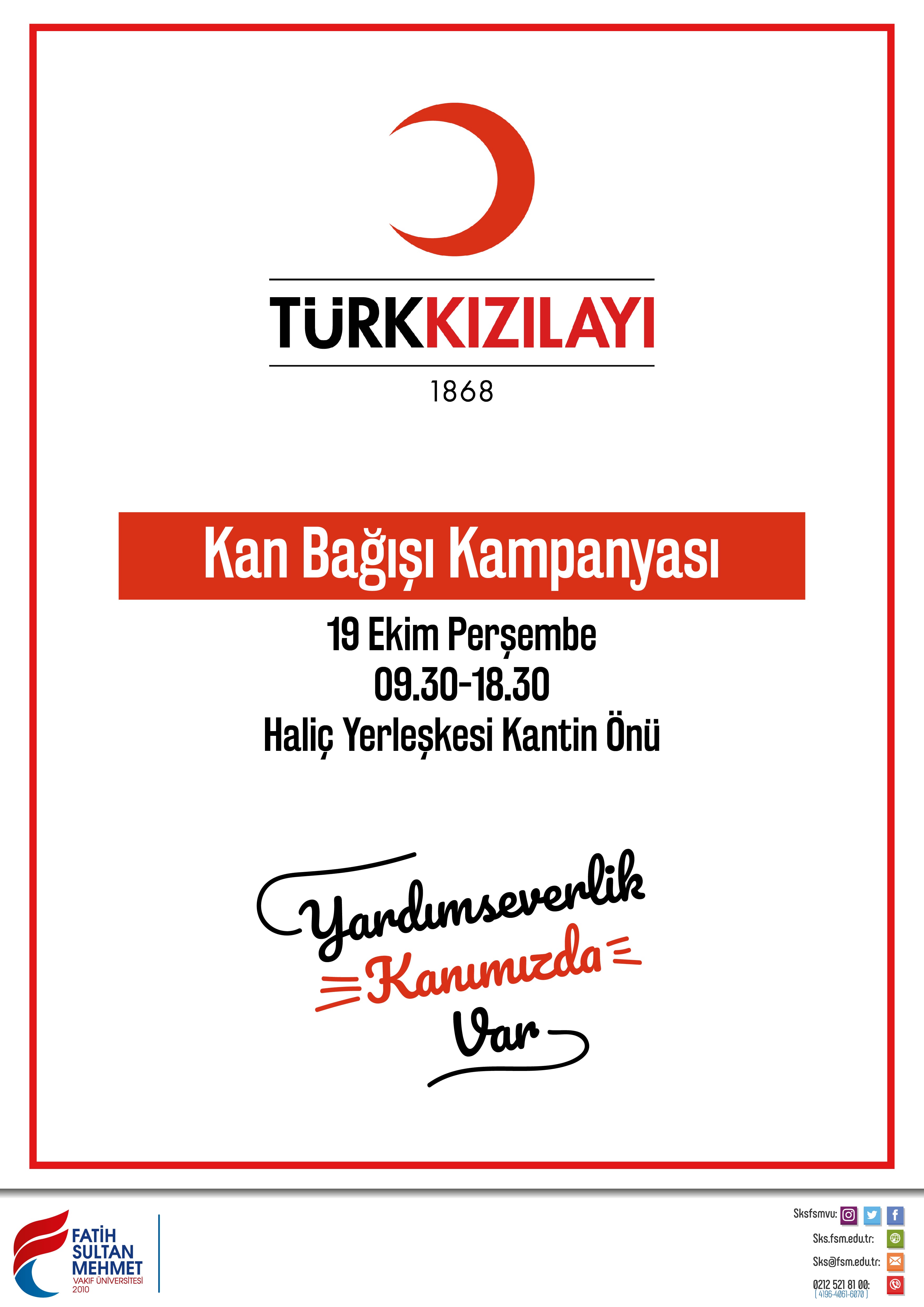Kızılay'ın kan bağışı çadırı 19 Ekim Perşembe günü saat 09.30-18.30 arası Haliç Yerleşkesi kantin önünde kurulacaktır. Herkesi kan bağışlamaya davet ediyoruz.