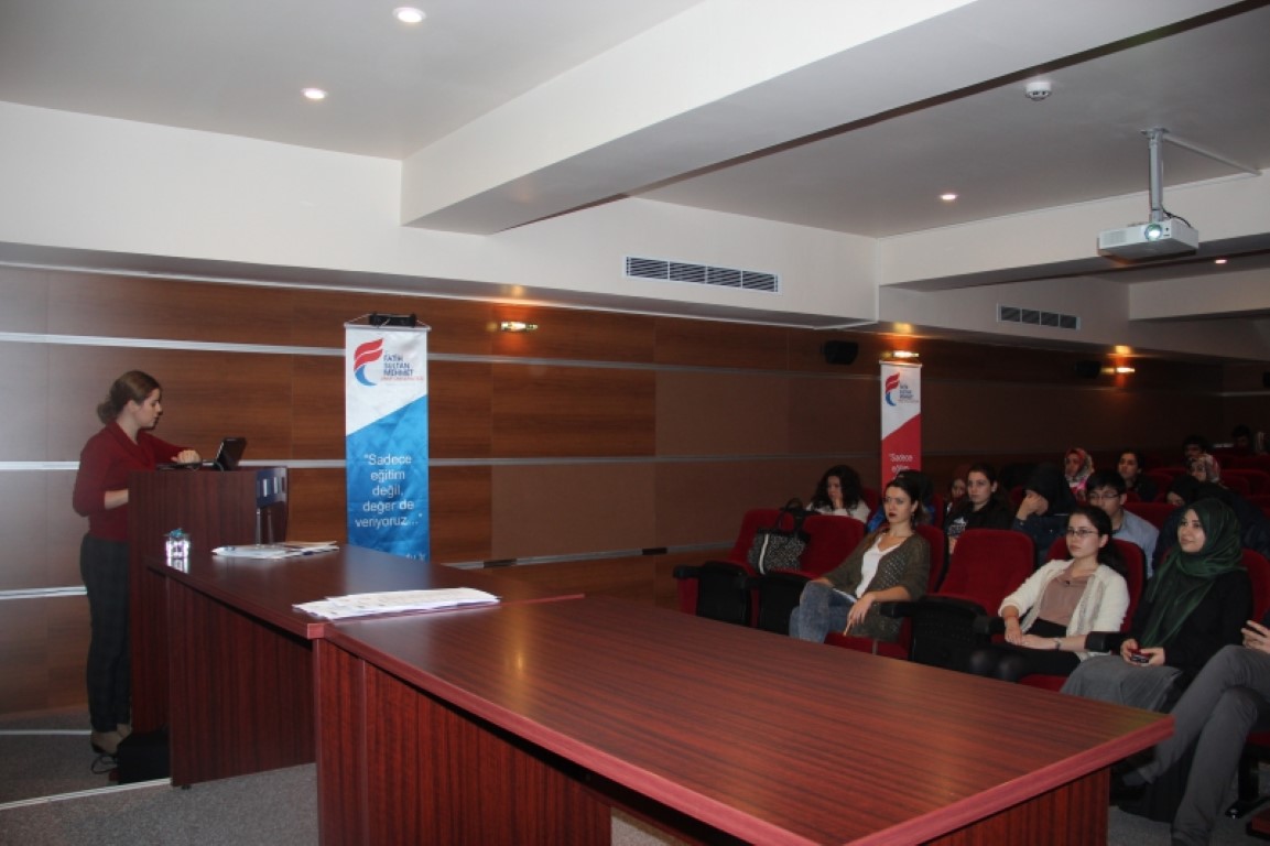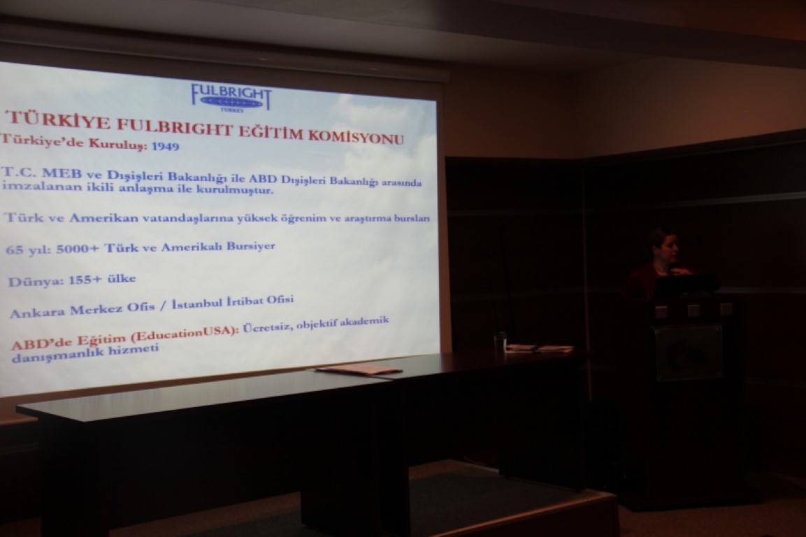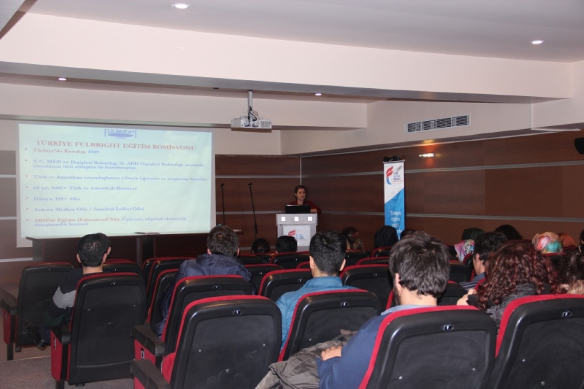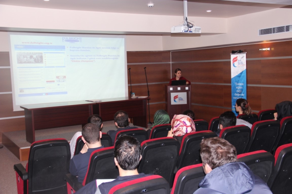 Fulbright Eğitim Danışmanı Merih Uğurel KAMIŞLI'nın verdiği toplantıda, öğrencilerimize Amerika'da ön lisans, yüksek lisans ve doktora programlarına kabul almak için gerekli şartlar anlatılmış ve başvuru süreci hakkında bilgi verilmiştir.