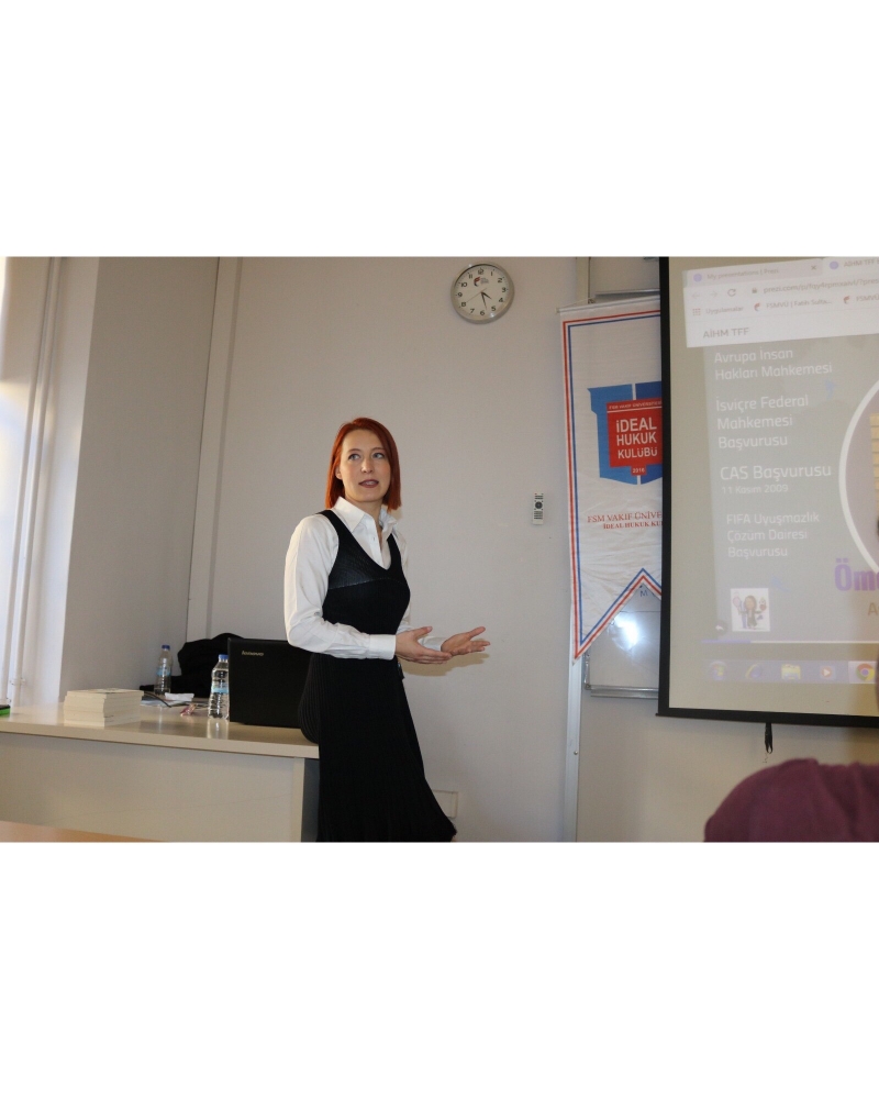 Avukat Aysu Melis Bağlan spor hukuku bağlamında tahkim yargılaması ve tahkimde görülen önemli sporcu davaları hakkında dinleyicileri bilgilendirdi. Soru cevapla devam eden programda üç öğrenciye Bağlan’ın “Anne Ben Şike Mağduru Muyum?” adlı kitabı hediye edildi. Ardından İdeal Hukuk Kulübü Başkanı Meltem Kalkanoğlu tarafından Bağlan’a hediye takdiminde bulunuldu.