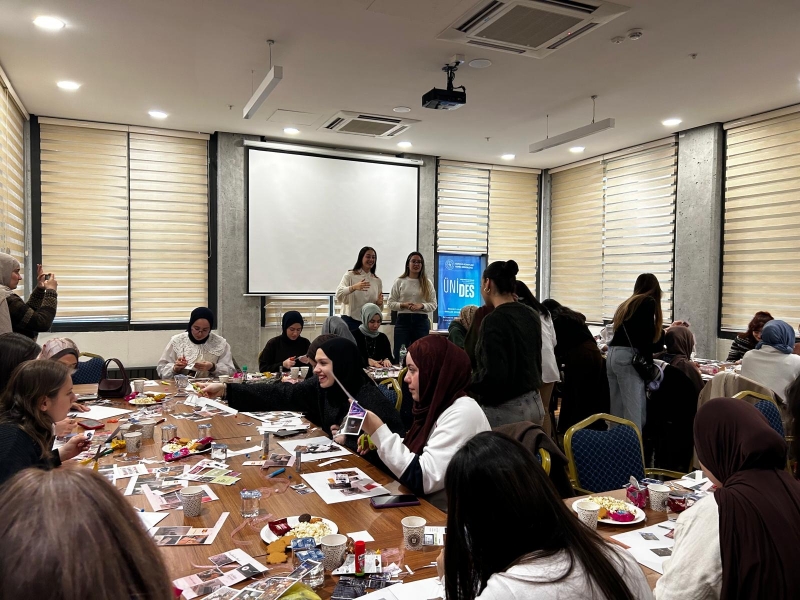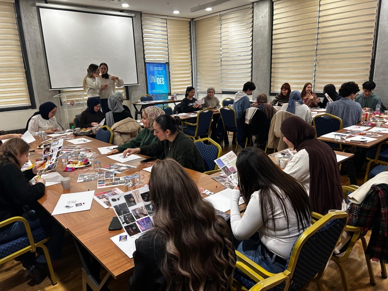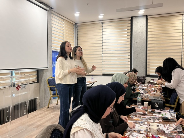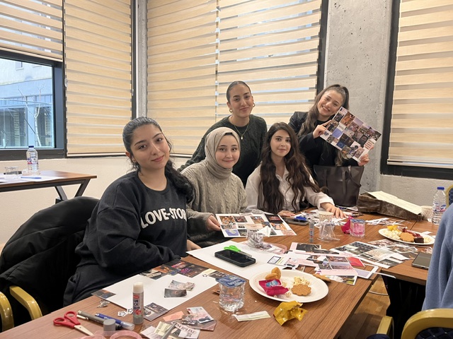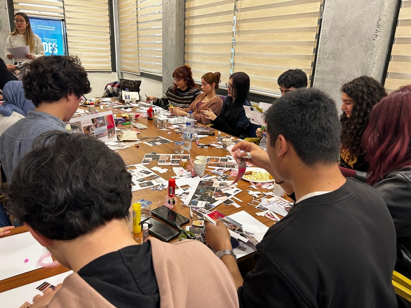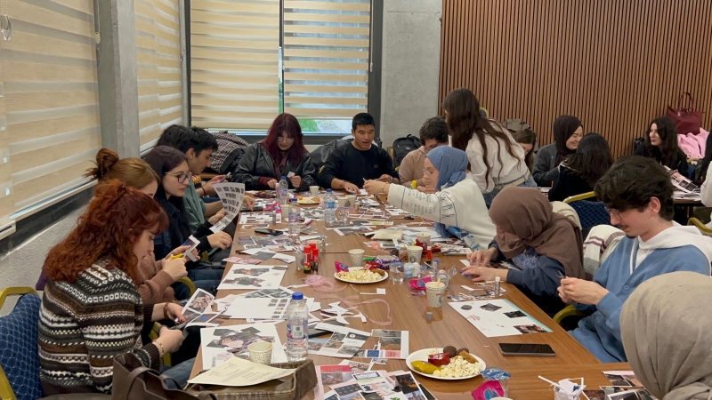 Etkinlik süresince katılımcılar hem bireysel olarak çalışmalarını sürdürdü hem de zaman zaman birbirlerinin panolarını inceleyerek sohbet etti. Masa başında gerçekleşen bu etkileşimler, müzik eşliğinde samimi ve üretken bir çalışma ortamı oluşturdu. Ortak paylaşımlar aracılığıyla öğrenciler motivasyonlarını artırırken, kişisel gelişimlerine katkı sağlayacak bir süreç deneyimledi.